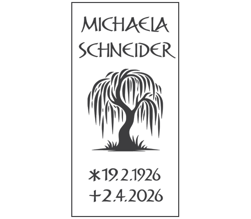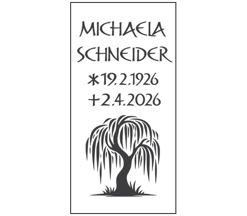 1. Geben Sie den Namen sowie das Geburts- und Sterbedatum ein (Pflichtfeld, max. 50 Zeichen). Optional können Sie zusätzlich einen kurzen Text oder Spruch (max. 40 Zeichen) eingeben. Siehe Beispiel bei den Produktbildern.